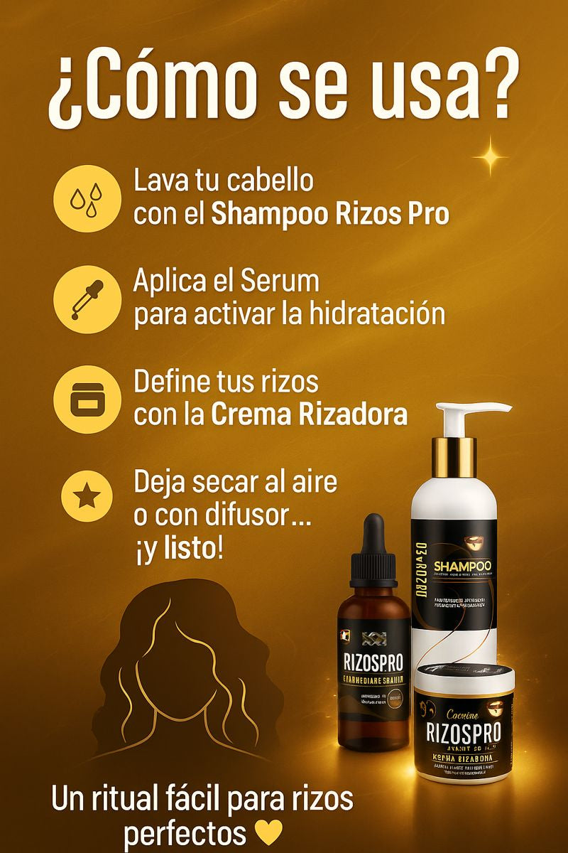 El Combo RizosPro actúa hidratando, nutriendo y moldeando la fibra capilar. El shampoo limpia sin resecar, la crema define cada rizo de forma uniforme y el serum sella la hidratación para lograr un acabado brillante y libre de frizz. Su fórmula activa reestructura y recupera rizos dañados, devolviendo elasticidad, movimiento y forma natural.
